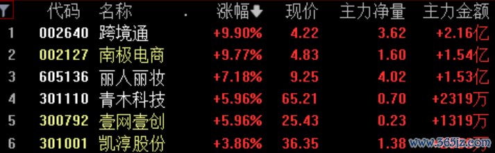 互联网电商板块表现活跃,跨境通、南极电商、丽人丽妆等涨幅居前。