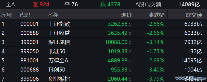 Wind数据显示,全市场下跌个股超4300只。沪深两市成交额约1.4万亿元。